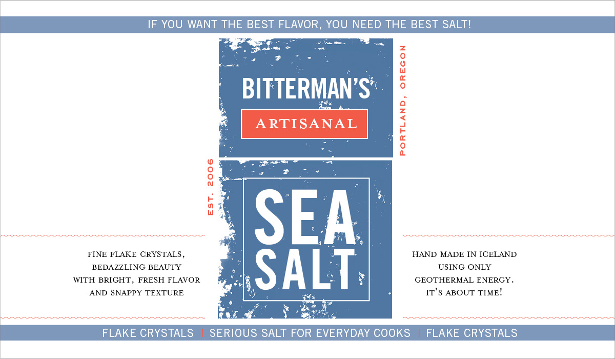 The Meadow, an emporium focusing on artisan chocolates, gourmet speciality salts, wine, bitters and flowers, asked me to design artisanal sea salt packaging. Concepts included French apothecary design to hip contemporary grunge.