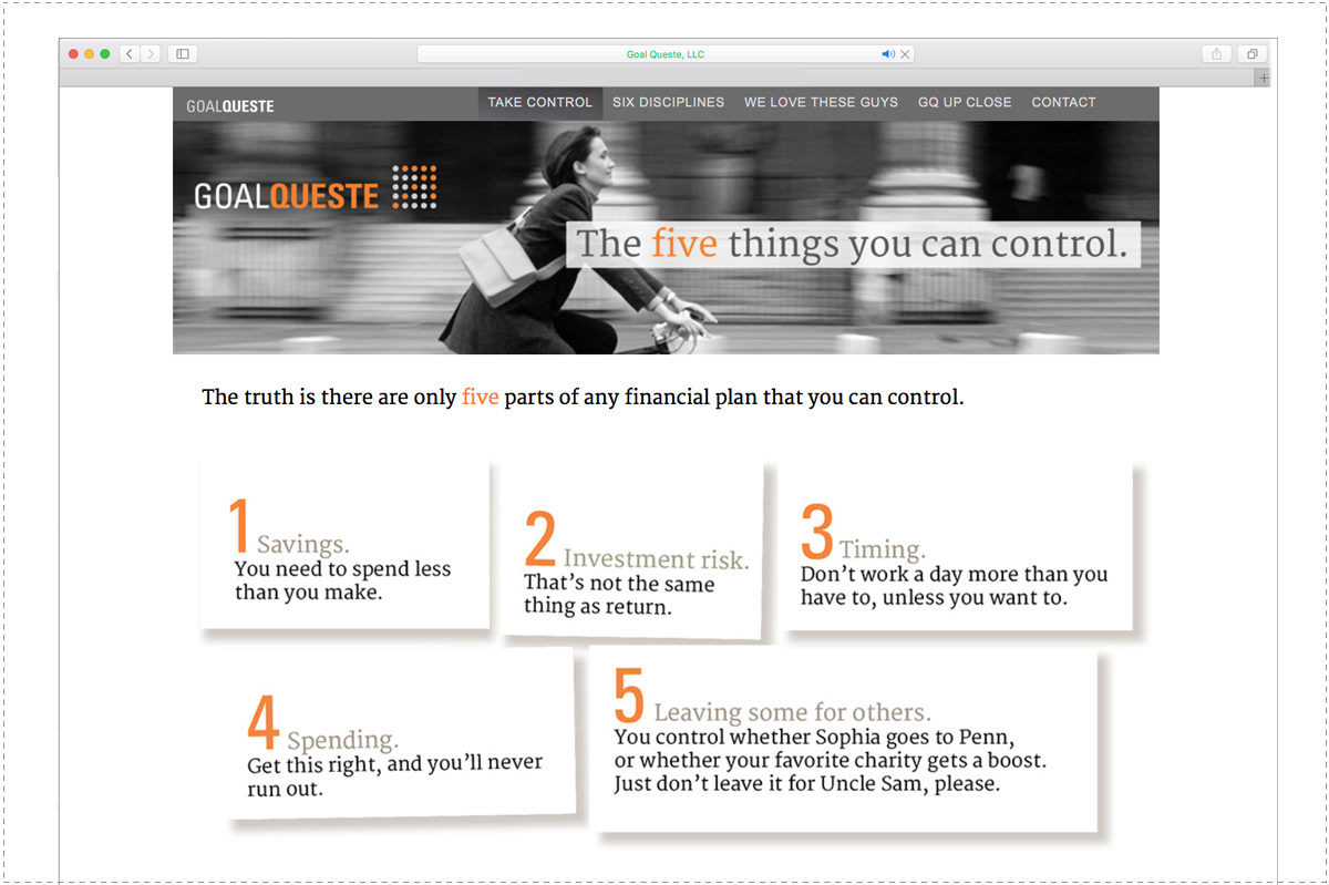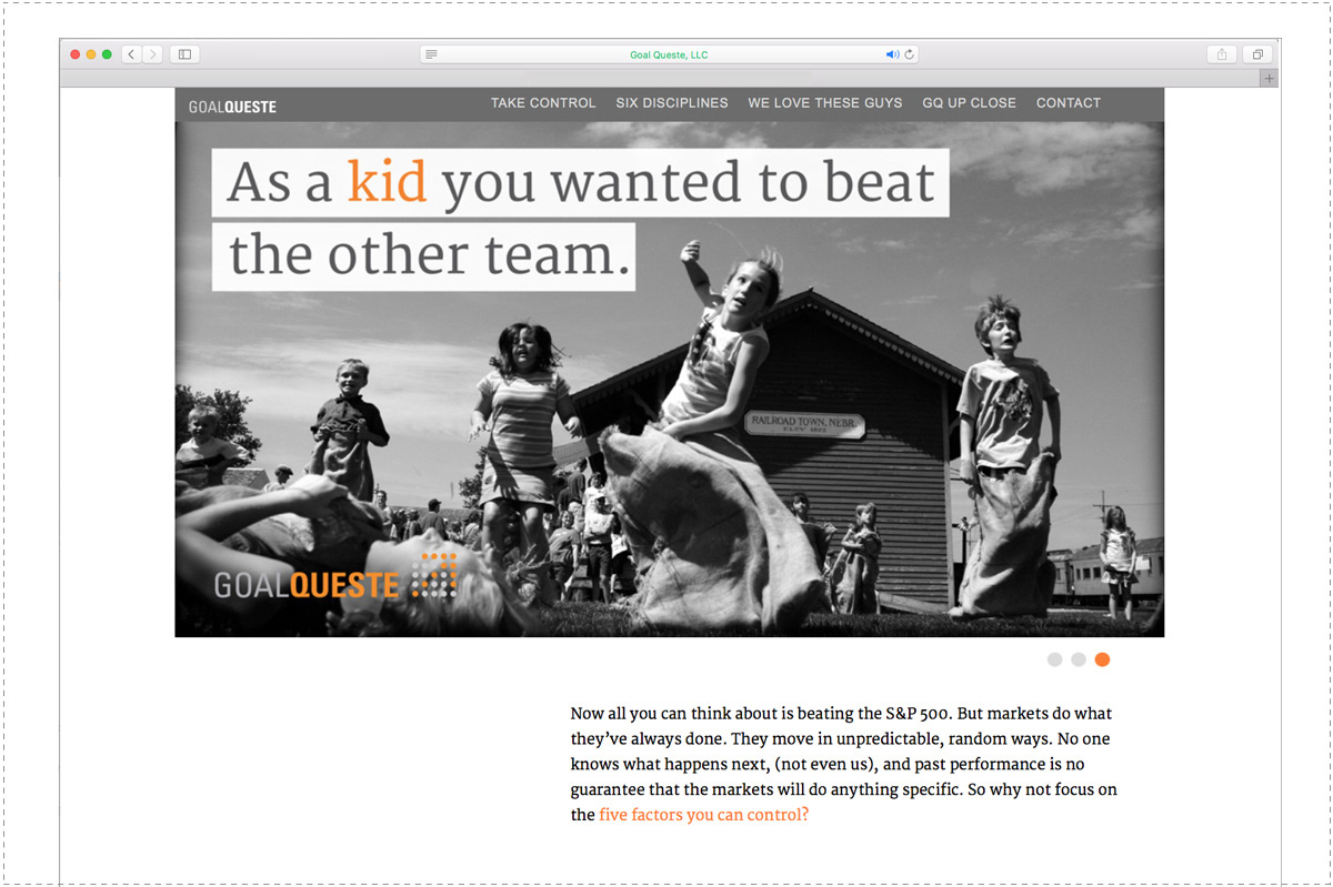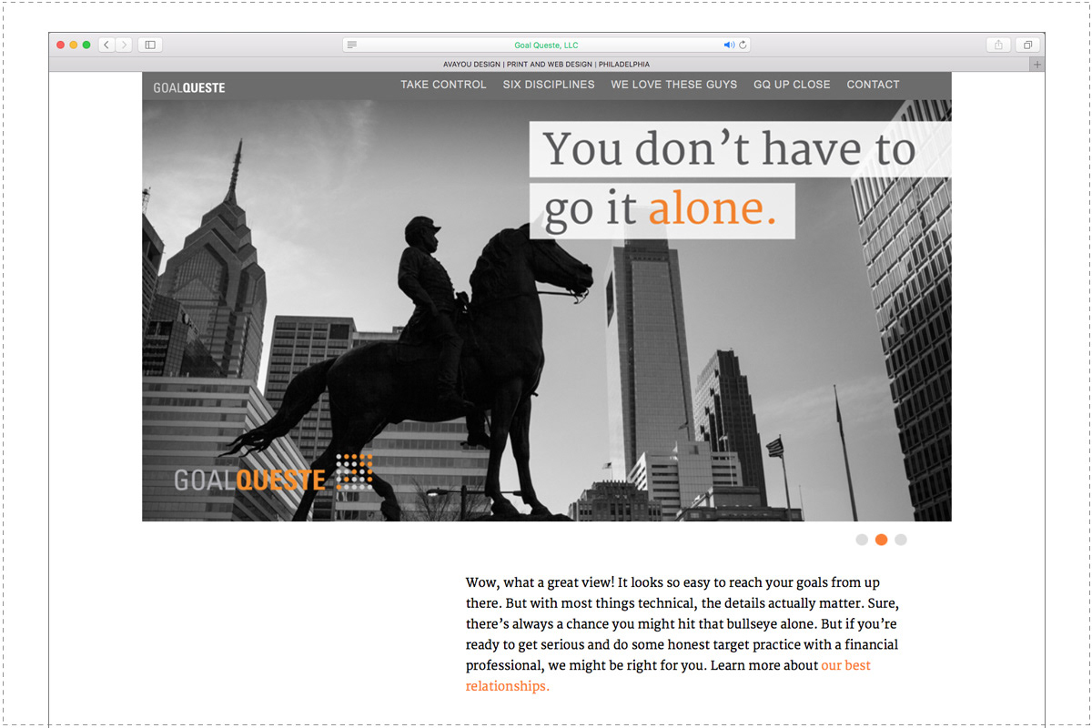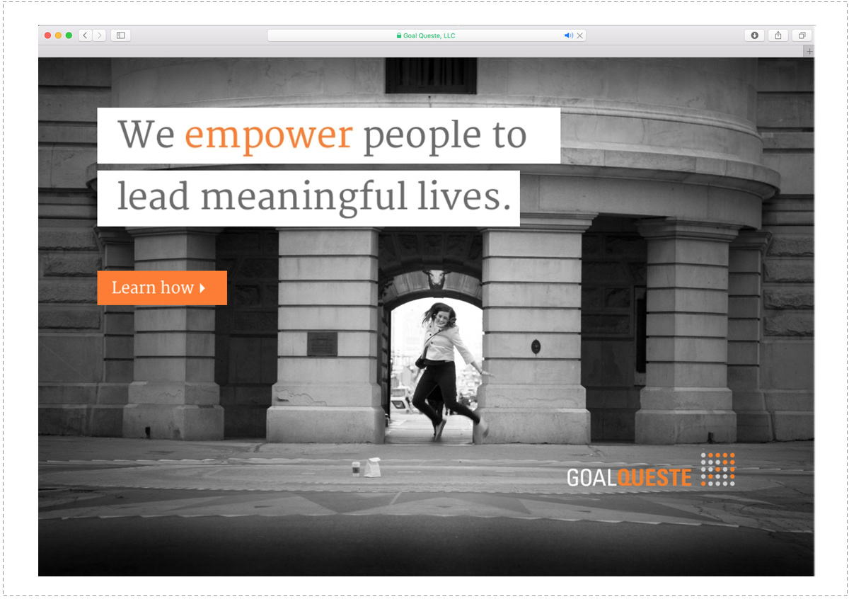 GoalQueste, a fee-only certified financial planning firm, engaged us to build their brand identity and website. Goalqueste.com welcomes clients with dramatic black and white photography, forward thinking copy and practical advice for how to approach your financial goals.