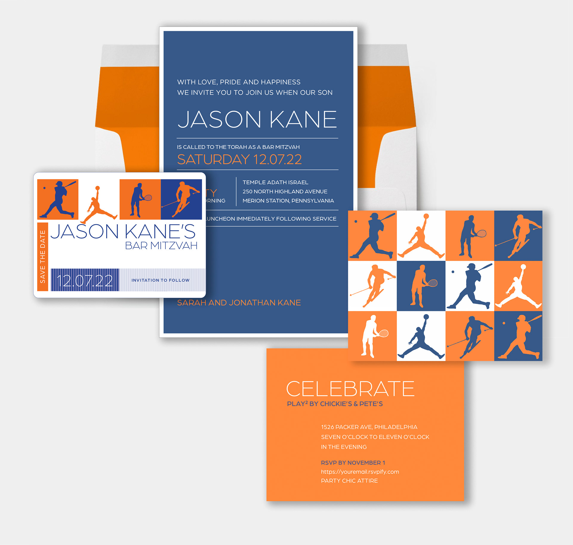Design of a Bar Mitzvah invitation package with a theme to reflect Jason's passion for his favorite sports. Included are invitation with lined envelope, RSVP card, and save-the-date magnet.